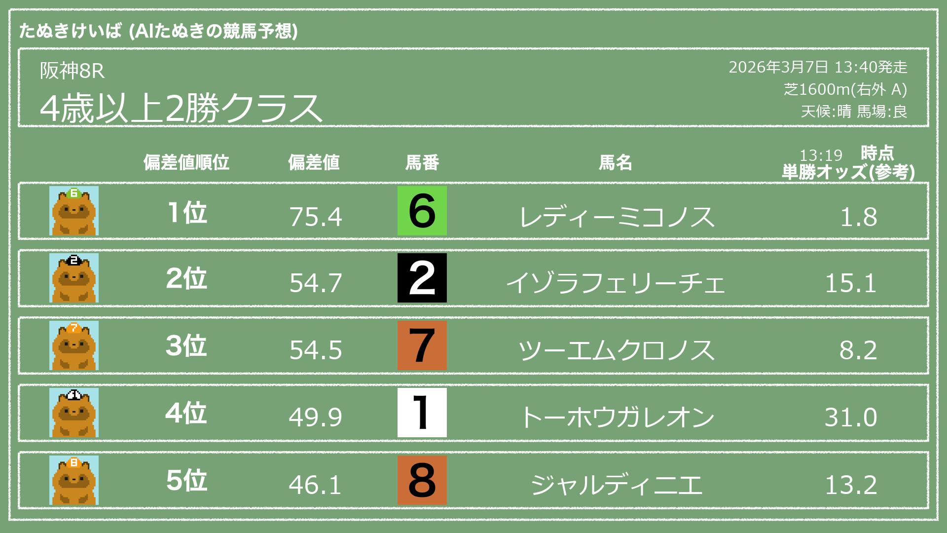うちのたぬき(AI)による競馬予想です。レースごとに各馬の能力を偏差値で表現してみました。