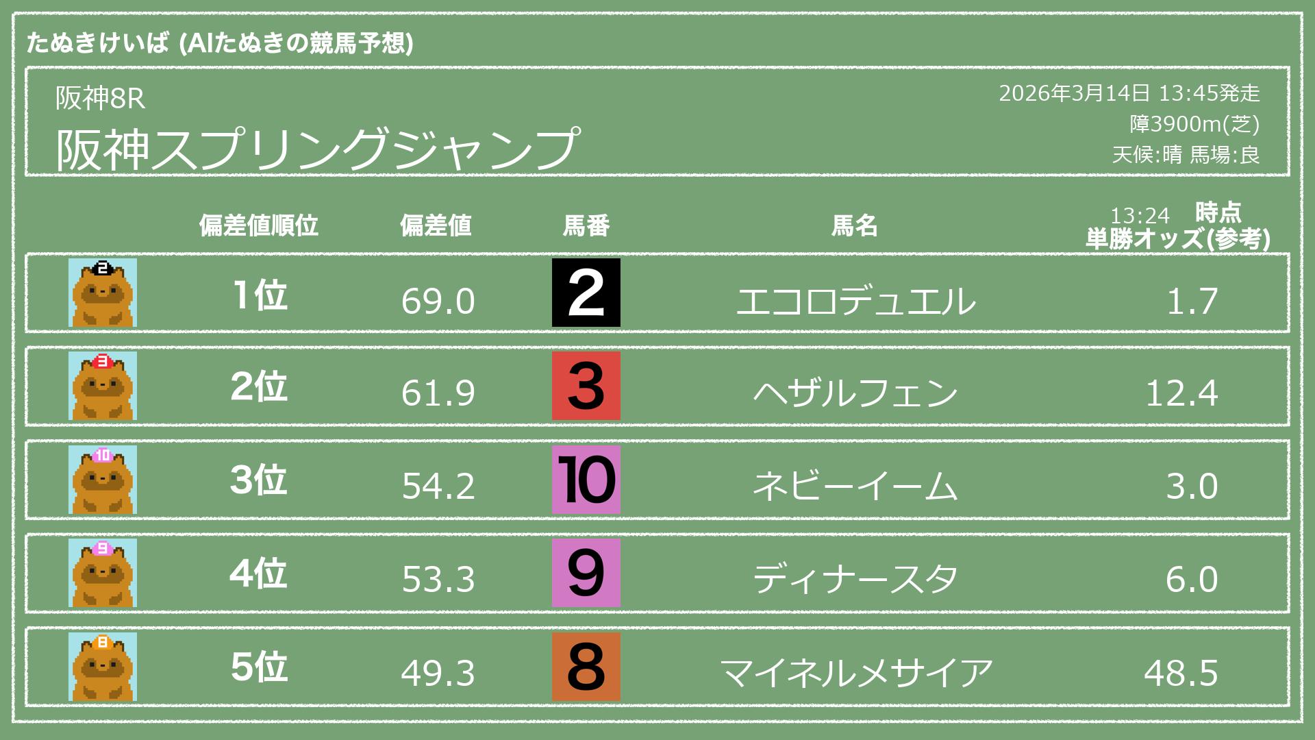 うちのたぬき(AI)による競馬予想です。レースごとに各馬の能力を偏差値で表現してみました。