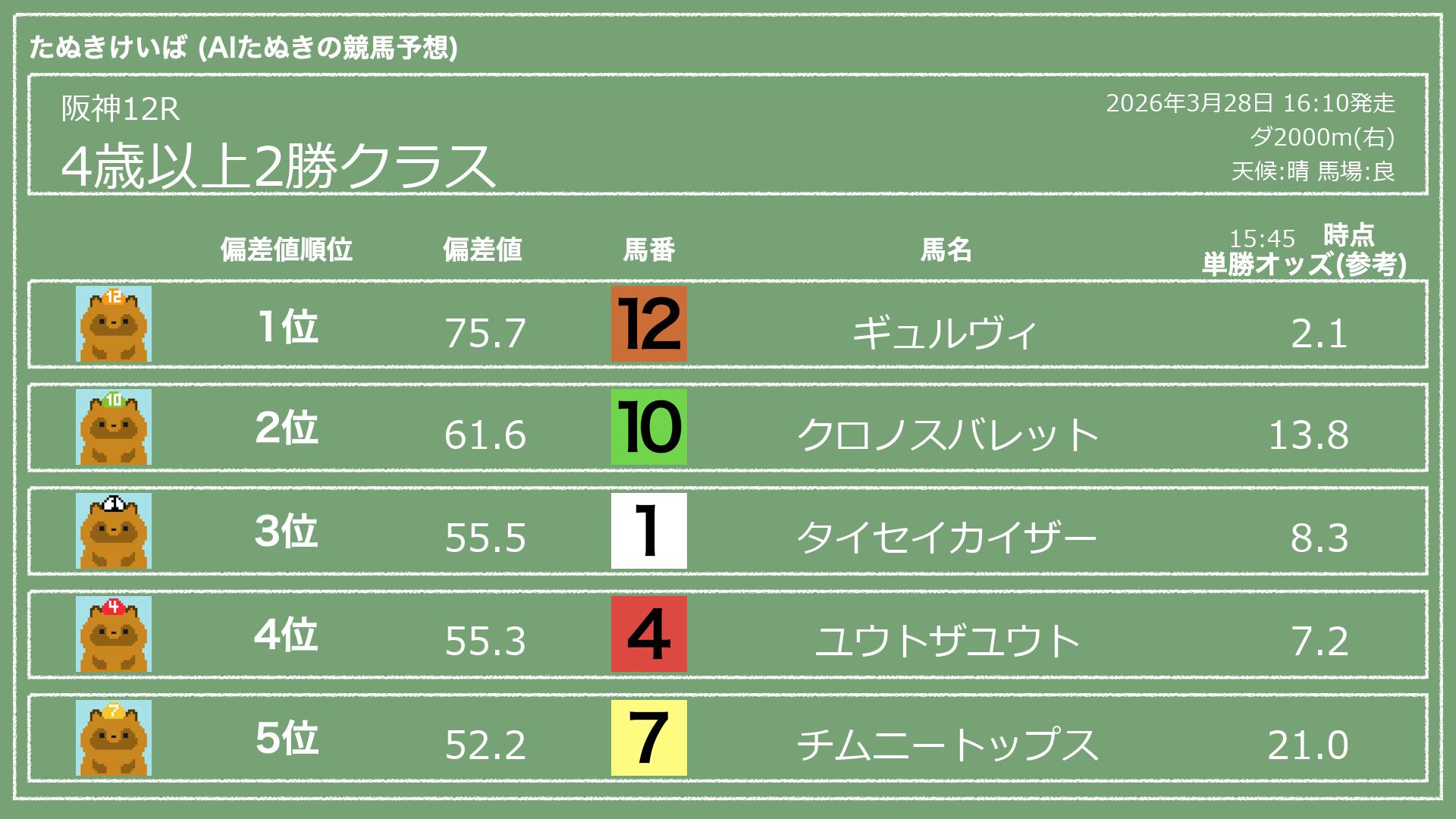 うちのたぬき(AI)による競馬予想です。レースごとに各馬の能力を偏差値で表現してみました。