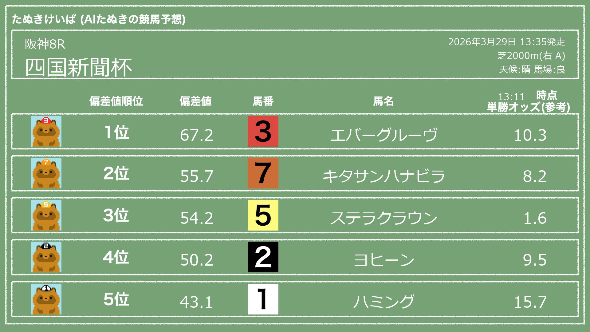 うちのたぬき(AI)による競馬予想です。レースごとに各馬の能力を偏差値で表現してみました。