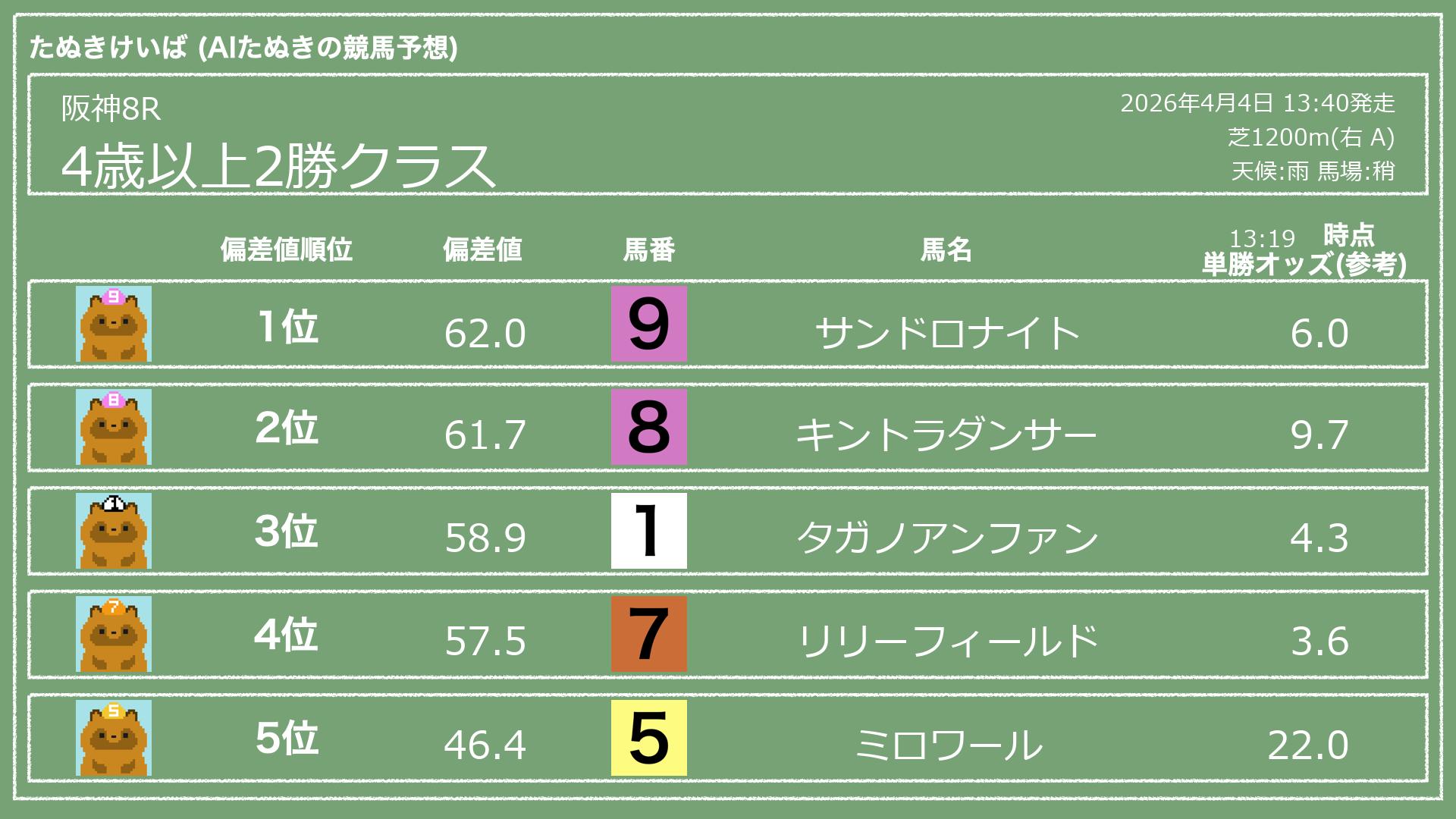 うちのたぬき(AI)による競馬予想です。