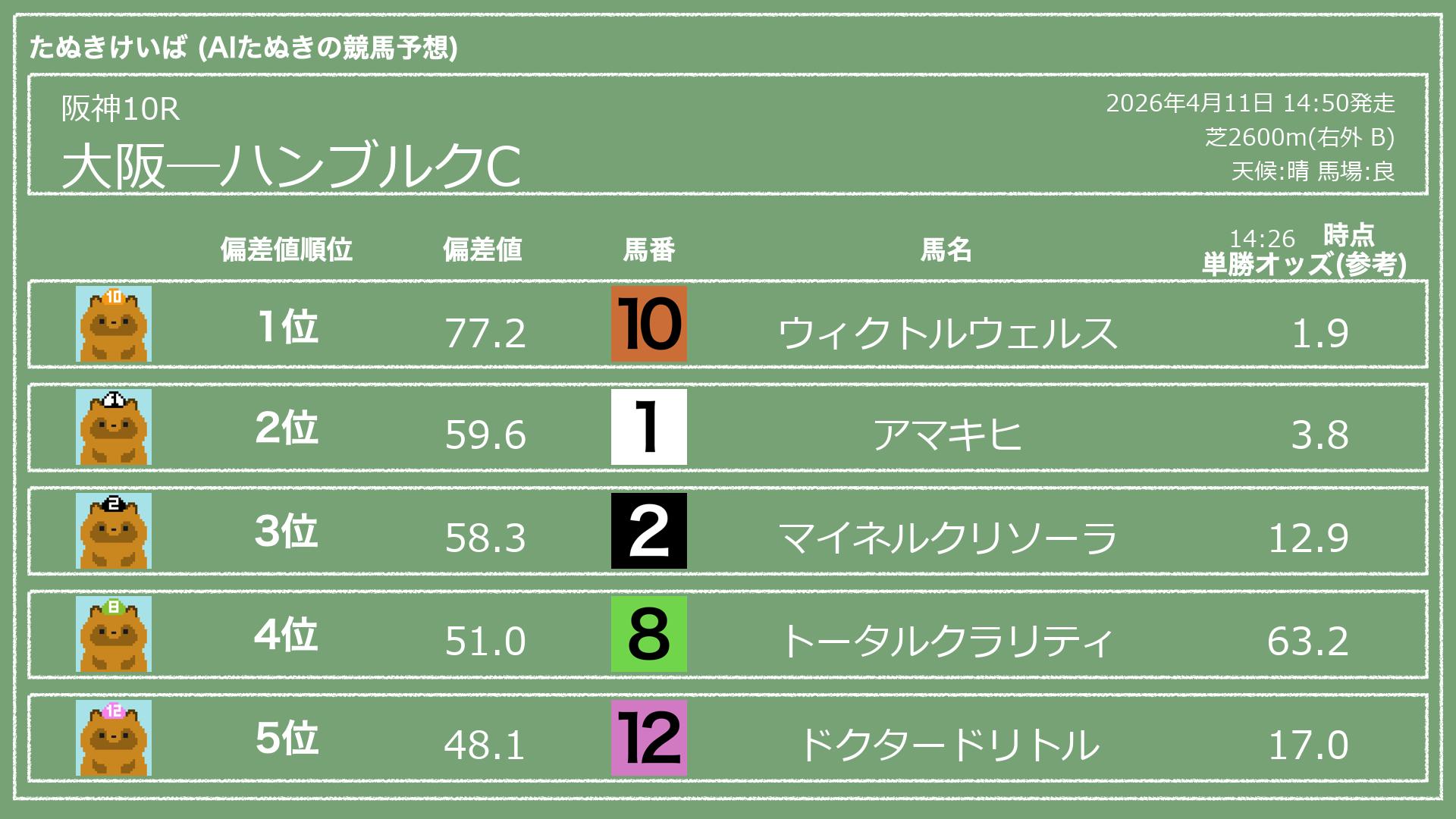 うちのたぬき(AI)による競馬予想です。レースごとに各馬の能力を偏差値で表現してみました。