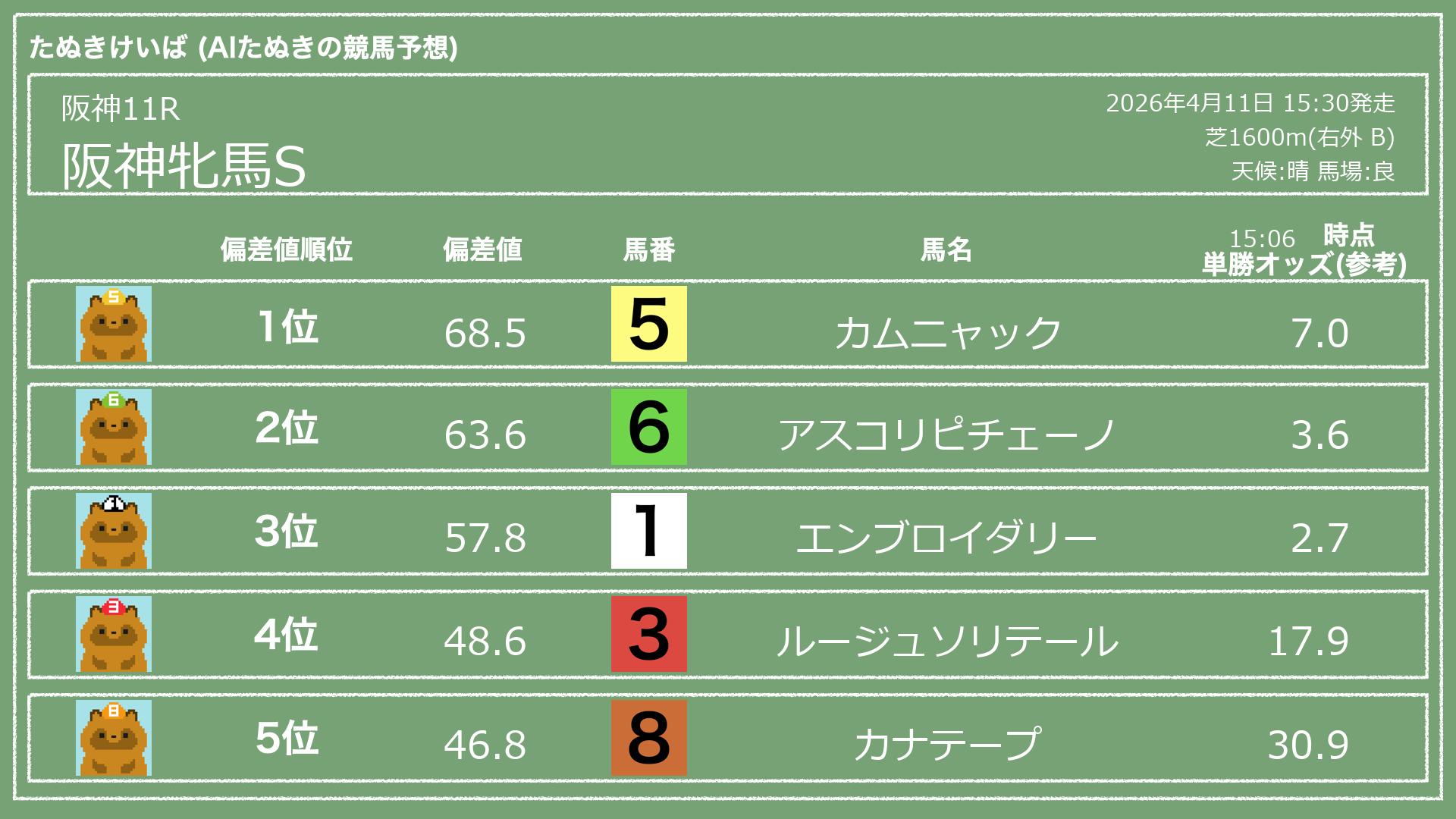 うちのたぬき(AI)による競馬予想です。レースごとに各馬の能力を偏差値で表現してみました。