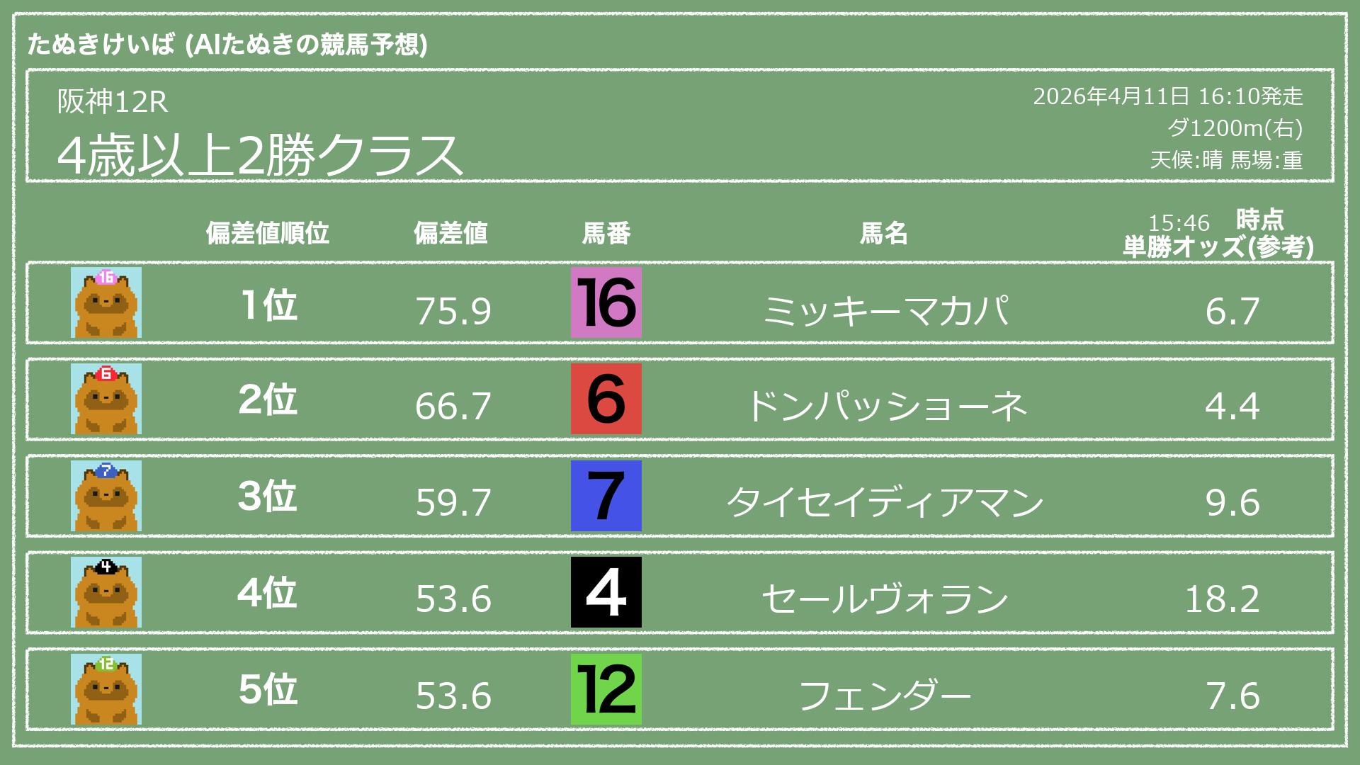 うちのたぬき(AI)による競馬予想です。レースごとに各馬の能力を偏差値で表現してみました。