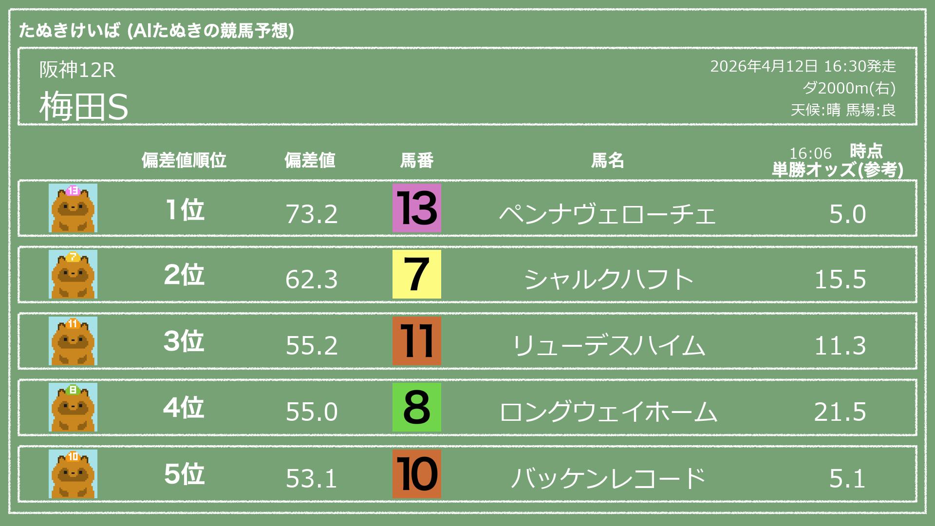 うちのたぬき(AI)による競馬予想です。レースごとに各馬の能力を偏差値で表現してみました。