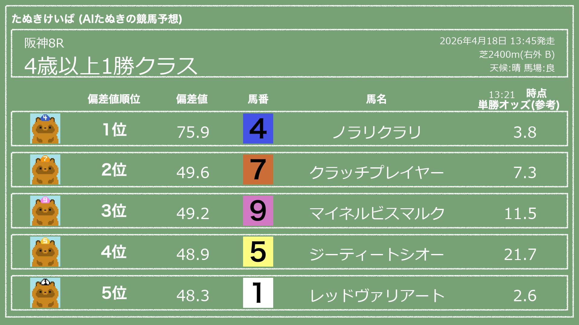 うちのたぬき(AI)による競馬予想です。レースごとに各馬の能力を偏差値で表現してみました。