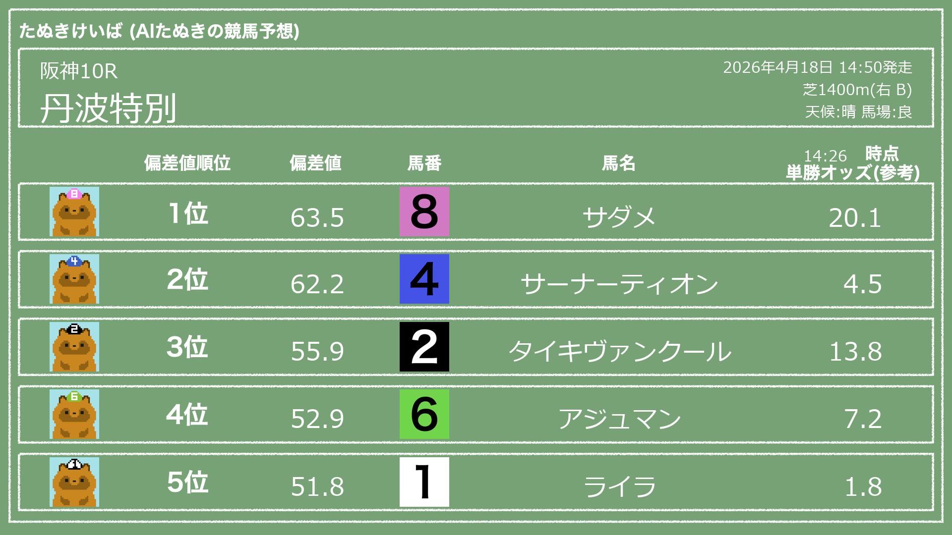 うちのたぬき(AI)による競馬予想です。レースごとに各馬の能力を偏差値で表現してみました。