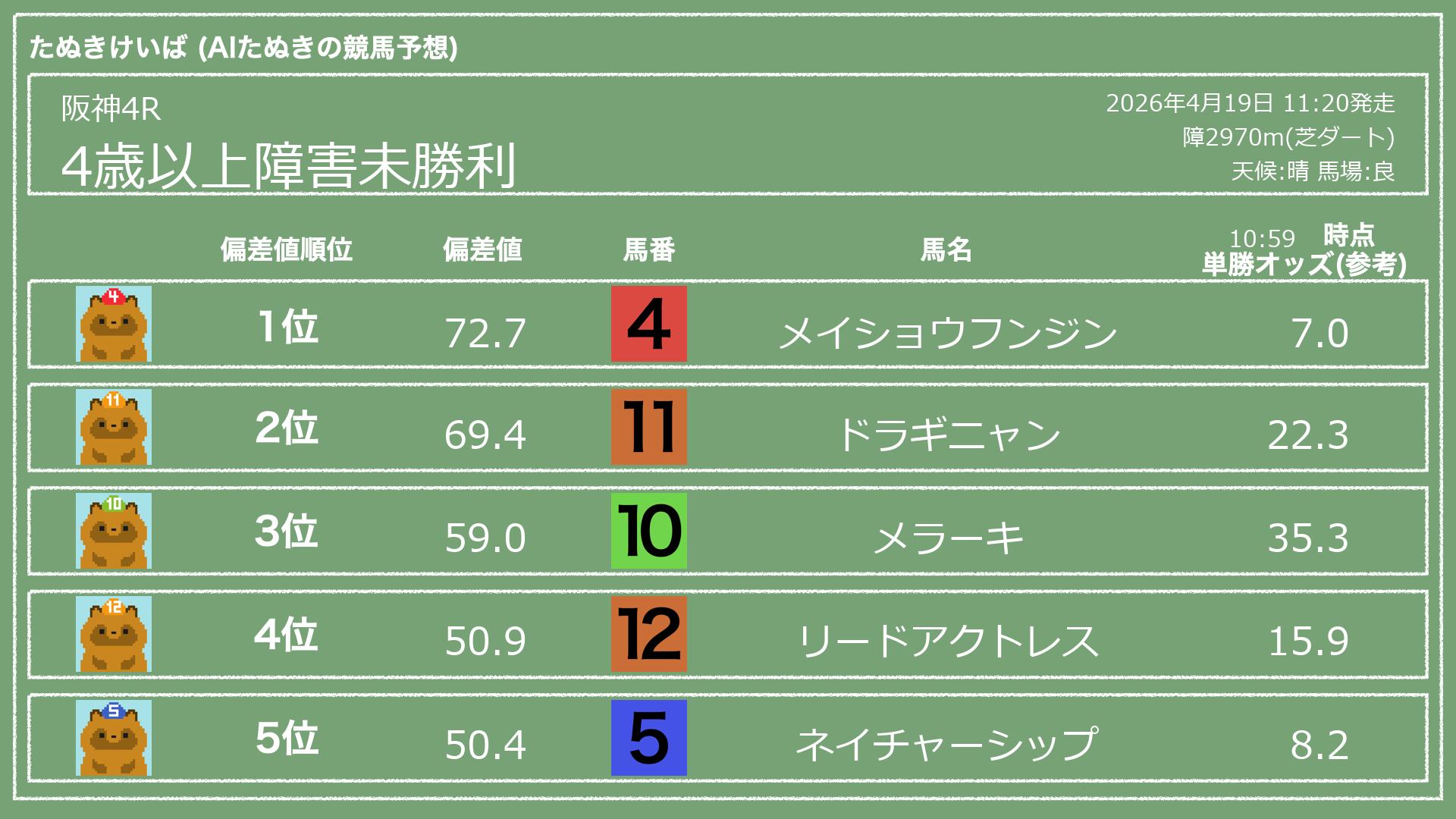 うちのたぬき(AI)による競馬予想です。レースごとに各馬の能力を偏差値で表現してみました。