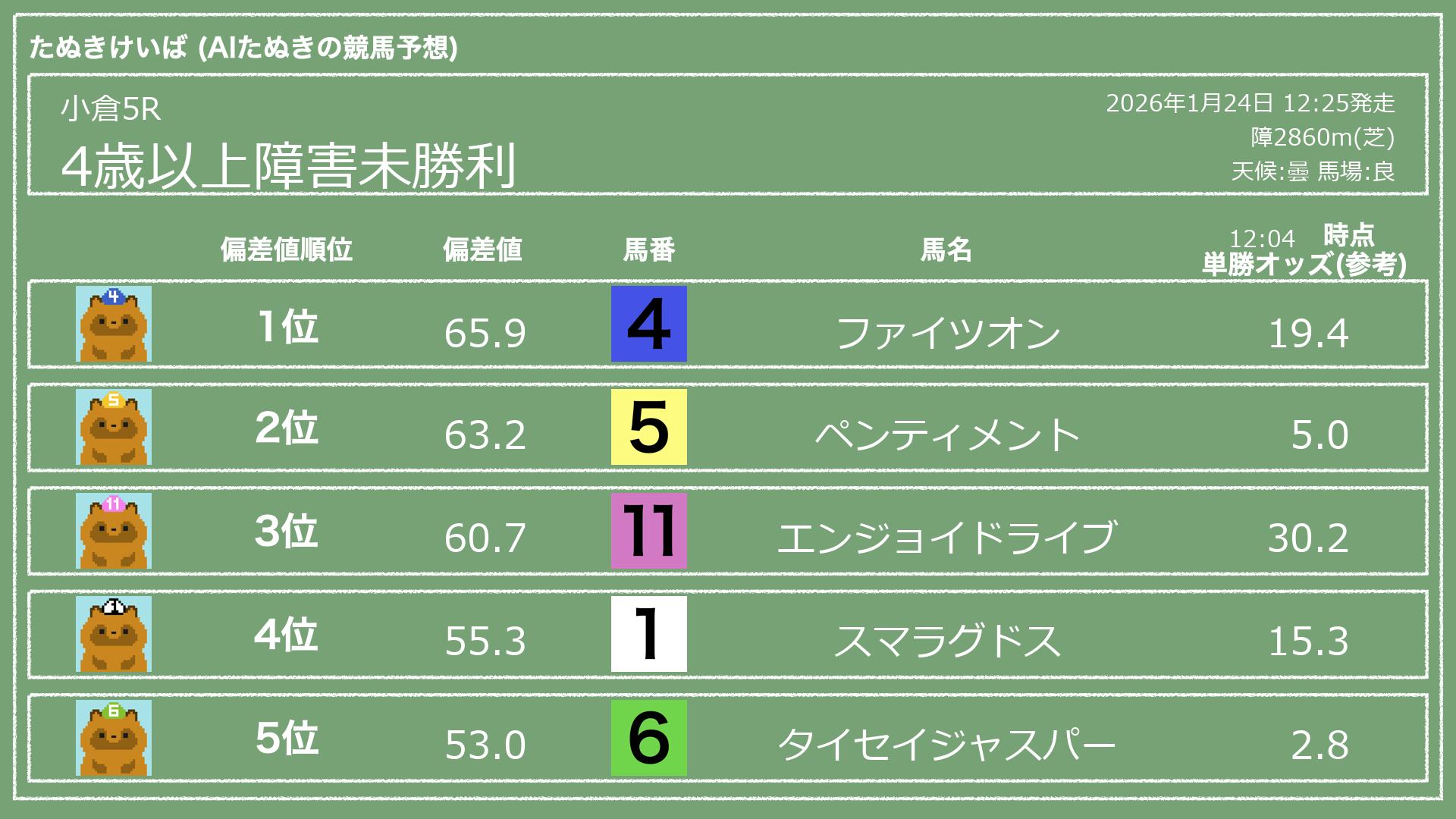うちのたぬき(AI)による競馬予想です。レースごとに各馬の能力を偏差値で表現してみました。