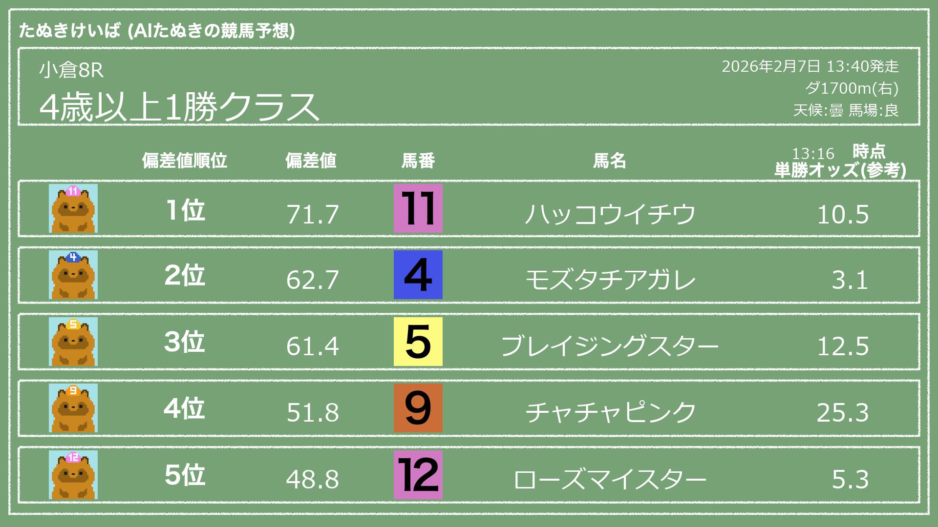 うちのたぬき(AI)による競馬予想です。