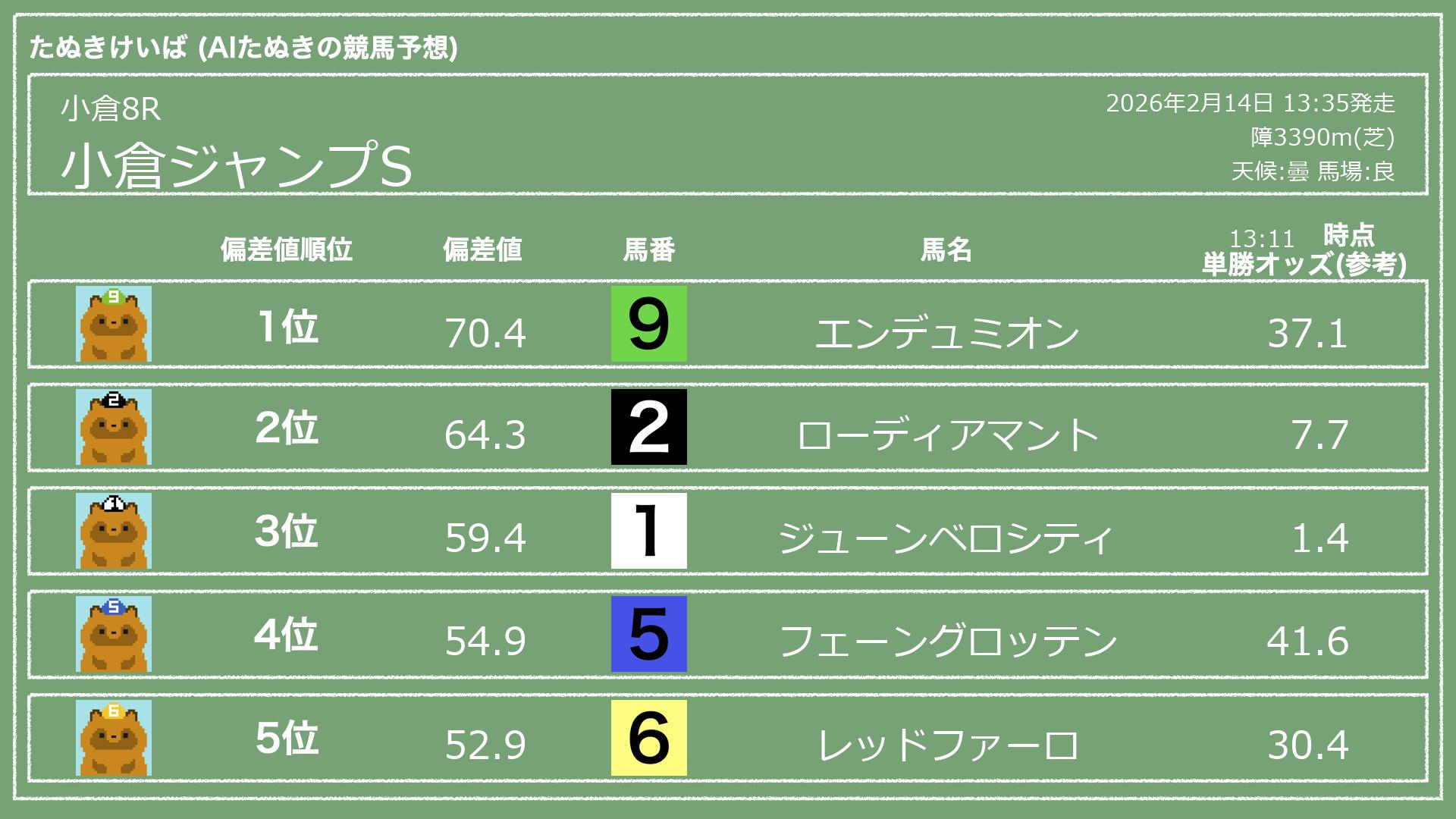 うちのたぬき(AI)による競馬予想です。レースごとに各馬の能力を偏差値で表現してみました。