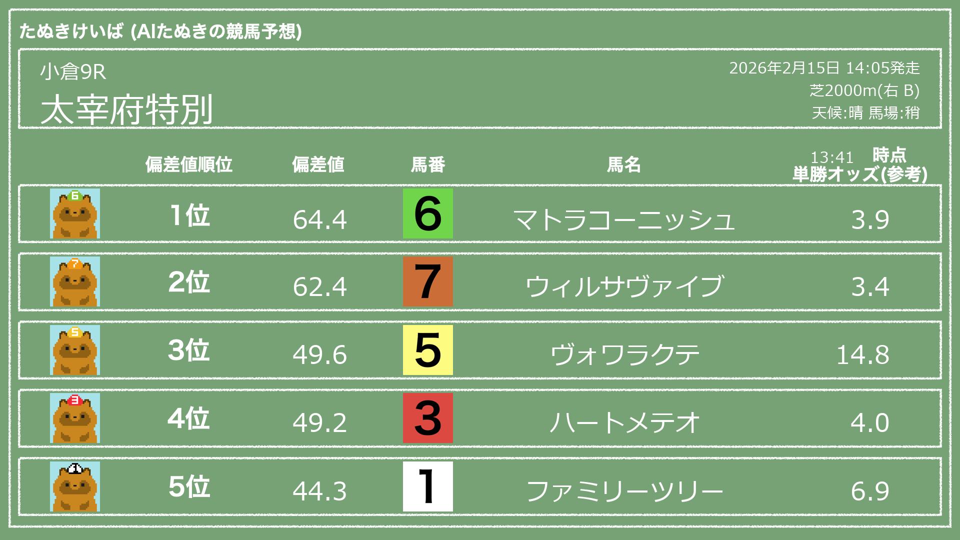 うちのたぬき(AI)による競馬予想です。
