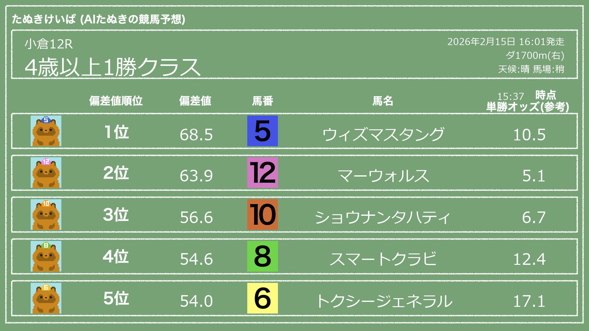 うちのたぬき(AI)による競馬予想です。レースごとに各馬の能力を偏差値で表現してみました。