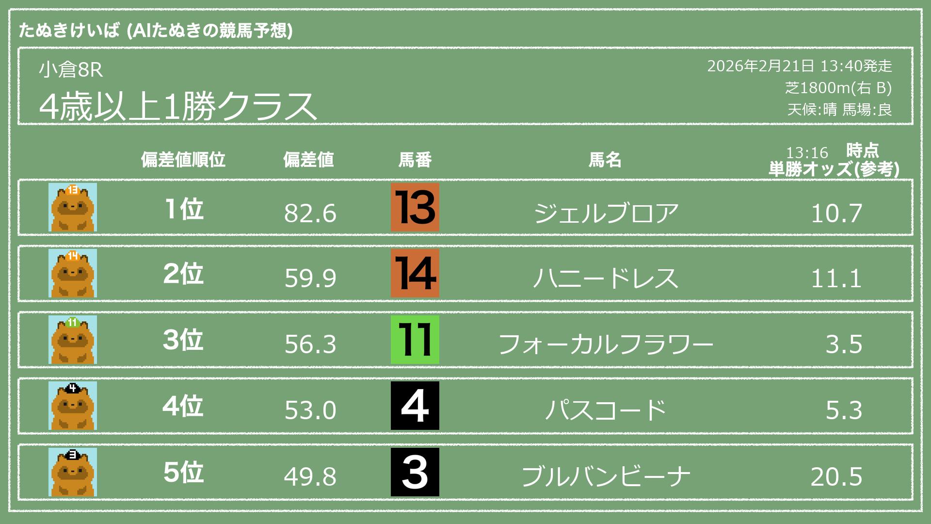 うちのたぬき(AI)による競馬予想です。レースごとに各馬の能力を偏差値で表現してみました。