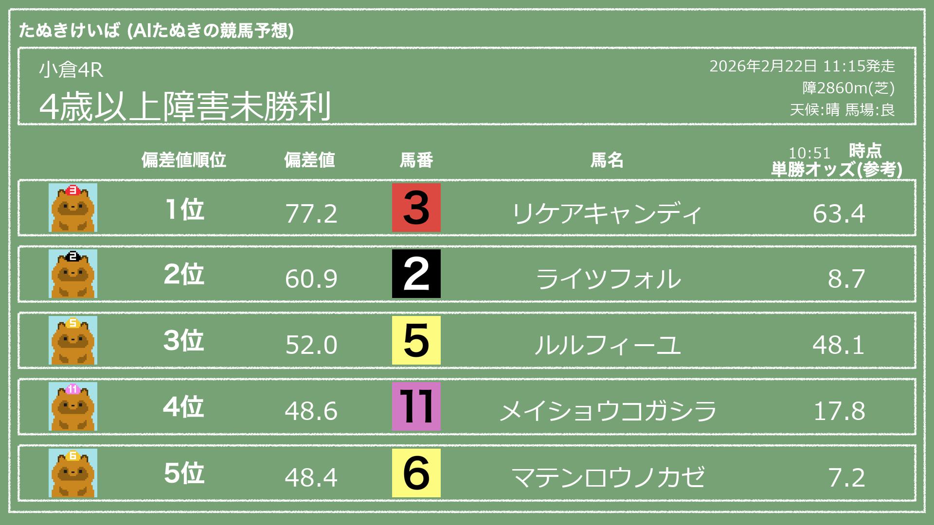 うちのたぬき(AI)による競馬予想です。