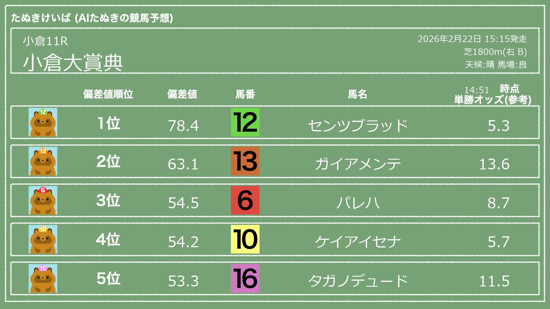 うちのたぬき(AI)による競馬予想です。レースごとに各馬の能力を偏差値で表現してみました。