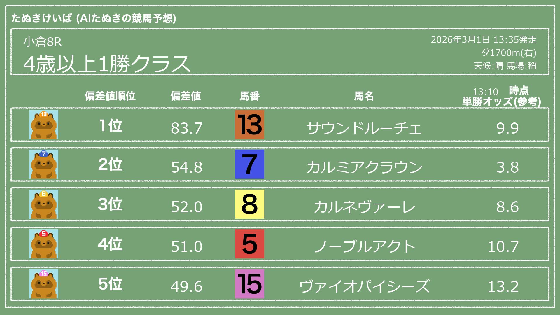 うちのたぬき(AI)による競馬予想です。
