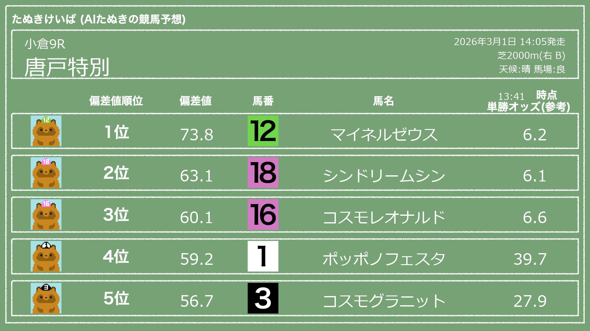 うちのたぬき(AI)による競馬予想です。