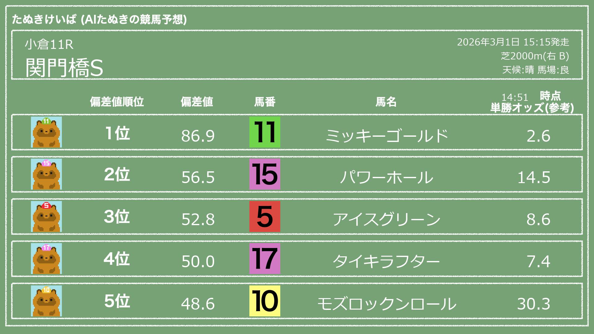 うちのたぬき(AI)による競馬予想です。レースごとに各馬の能力を偏差値で表現してみました。